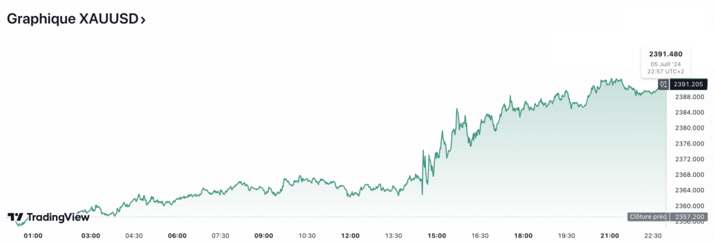 Tout d’abord, l’or, souvent considéré comme une valeur refuge en période d’incertitude économique et politique, continue d’attirer l’attention des investisseurs. Aujourd’hui, le prix de l’once d’or s’élève à 2391,48 dollars, marquant une augmentation de 1,4%. En ce samedi 06 juillet 2024, le prix du kilo d’or est estimé à 70 829 euros, tandis que le prix du gramme d’or 18 carats atteint les 70,83 euros. Cette tendance haussière est alimentée par une série de facteurs économiques et géopolitiques. Examinons de plus près ces éléments et leur impact sur le marché de l’or.