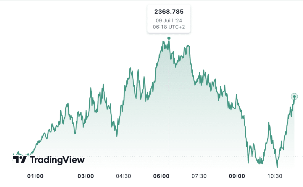 En ce mardi 09 juillet 2024, le marché de l’or fait l’objet d’une attention particulière. Ceci, alors que le prix du métal jaune enregistre une hausse significative de 0,2%. Le cours de l’or atteint les 2368,78 dollars l’once à 06h18 UTC+2. Le prix du kilo d’or est estimé à 70 183 euros et celui du gramme d’or 18 carats à 70,18 euros aujourd’hui.
