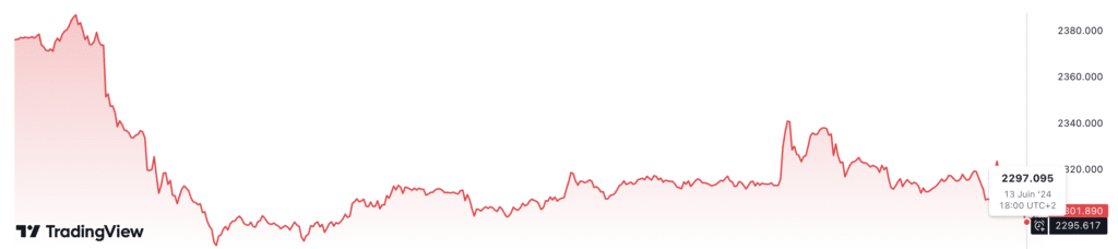 En ce jeudi 13 juin 2024, le cours de l’or a connu une journée particulièrement mouvementée. À 14h45 UTC+2, l’or a atteint les 2323,43 dollars l’once, son plus haut niveau dans la journée. Toutefois, cette hausse a été suivie par une chute en dessous du seuil critique de 2300 dollars l’once à 18h00. Cette fluctuation rapide démontre la volatilité actuelle du marché de l’or, influencée par divers facteurs économiques et politiques.