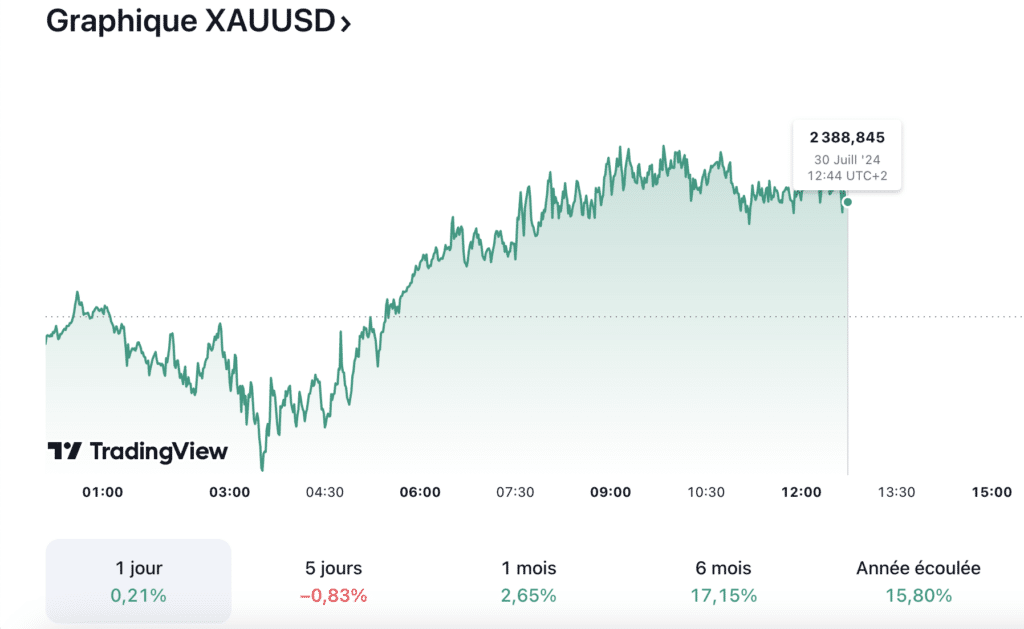 30/07 Prévisions du cours de l’or aujourd’hui. Aujourd’hui, le prix de l’or continue de démontrer sa résilience face aux turbulences économiques et géopolitiques. En ce mardi 30 juillet 2024, l’or maintient sa position, avec des prix stables sous la barre des 2 400 dollars l’once. Ainsi, les facteurs tels que les tensions au Moyen-Orient, les prévisions de baisse des taux de la Fed et les rapports économiques clés à venir influencent la trajectoire future de l’or. In fine, pour les investisseurs, l’or reste une option attrayante pour diversifier et protéger leurs portefeuilles. Les experts Abacor décryptent pour vous !