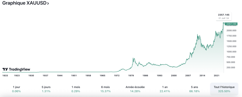 Aujourd’hui, l’or continue de jouer un rôle similaire en tant qu’or valeur refuge pour ceux qui recherche la stabilité et préservation de leur patrimoine. En effet, sa résistance aux fluctuations économiques et aux crises financières en fait un choix de prédilection pour ceux qui souhaitent multiplier leur pouvoir d’achat.