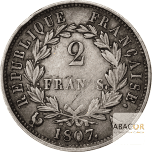 Le revers de la pièce arbore l’inscription « RÉPUBLIQUE FRANÇAISE », disposée en cercle autour du motif central. Au centre, l’indication de valeur « 2 FRANCS » est élégamment entourée d’une couronne de laurier, symbole de gloire et de victoire. Enfin, en bas de la pièce, le millésime 1807 ou 1808 est frappé, accompagné d’une lettre indiquant l’atelier de fabrication, permettant d’identifier son origine précise.