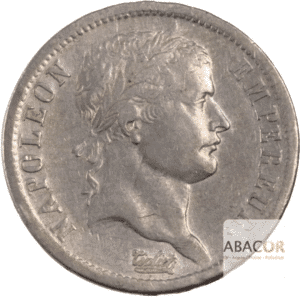 Sur l’avers de la pièce, on retrouve le portrait de Napoléon Ier lauré, tourné vers la droite, symbole de son autorité impériale. Autour de son buste, se grave en lettres majuscules l’inscription « NAPOLEON EMPEREUR ».