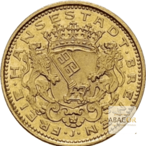 Pièce d’or 10 Mark Or Brême. Abacor, comptoirs experts en numismatique depuis près de 30 ans, vous accompagnent dans l’achat de pièces d’or, alliant investissement sûr et passion pour l’histoire. Cette pièce d’or est aujourd’hui très recherchée par les collectionneurs en raison de son lien avec l’histoire de l’Empire Allemand et son statut de monnaie d’or. La 10 Mark Or Bremen peut avoir une valeur numismatique importante en fonction de son état, et elle représente un bel exemple de la monnaie produite avant la Première Guerre mondiale, avant l’inflation et la dévaluation de la monnaie qui suivra.