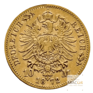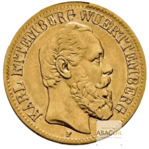 Pièce d’or 10 Mark Or Karl Ier. Abacor, comptoirs experts en numismatique depuis près de 30 ans, vous accompagnent dans l’achat de pièces d’or, alliant investissement sûr et passion pour l’histoire. Le règne de Karl I a marqué une période de stabilité et de développement économique pour le royaume de Wurtemberg. La monnaie de cette époque reflète à la fois la prospérité de la région et la puissance de la famille royale. Les pièces frappées sous son règne, notamment la 10 Mark Or, sont particulièrement prisées par les numismates en raison de leur rareté et de la beauté de leurs frappes.