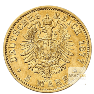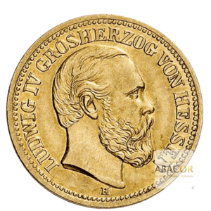Pièce d’or 5 Mark Or Ludwig IV. Abacor, comptoirs experts en numismatique depuis près de 30 ans, vous accompagnent dans l’achat de pièces d’or, alliant investissement sûr et passion pour l’histoire. La pièce d’or de 5 Mark Or Ludwig IV, a été frappée en 1877, sous l’Empire Allemand. En effet, la pièce porte l’effigie de Ludwig IV, Grand-Duc de Hesse, en hommage au souverain qu’elle représente.