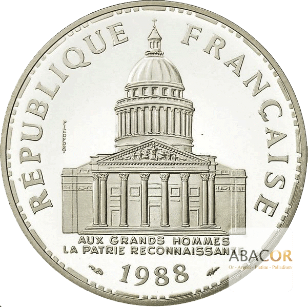 Pièce Argent 100 Francs Panthéon. Vous avez des pièces d’argent à vendre ? Bénéficiez d’une évaluation de vos Pièces d’Argent auprès de nos experts numismates. De plus, si vous souhaitez effectuer un Achat de Pièces d’Argent, les experts Abacor vous font bénéficier gratuitement de conseils en investissement selon votre profil d’investisseur et ce, toute l’année.