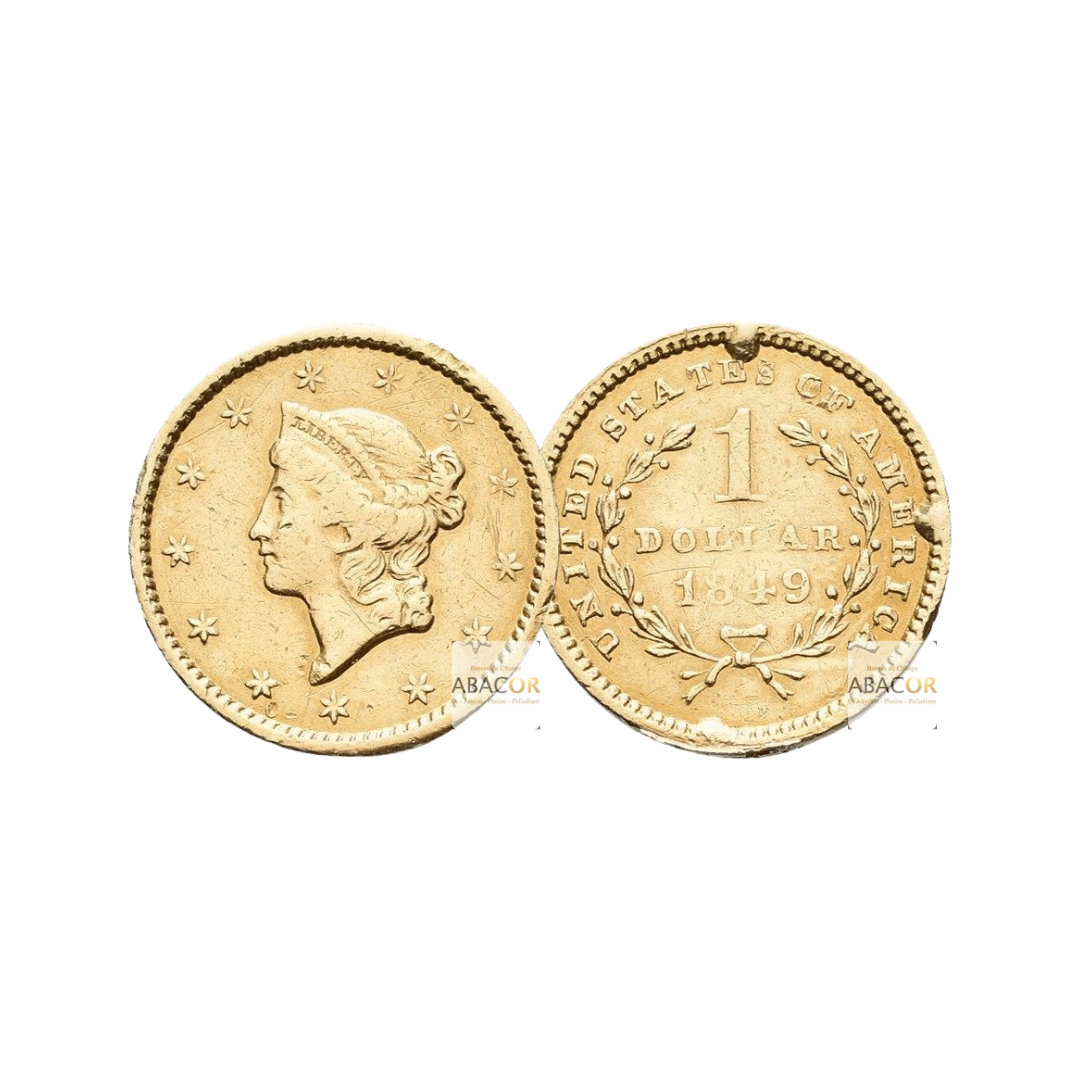 Pièces d’Or États-Unis. Émise pour la première fois en 1849 sous la présidence de Zachary Taylor, est la plus petite en taille jamais frappée par les États-Unis. Ces pièces d’or, ont été introduites suite à la ruée vers l’or en Californie, afin de tirer parti des nouvelles ressources en or.