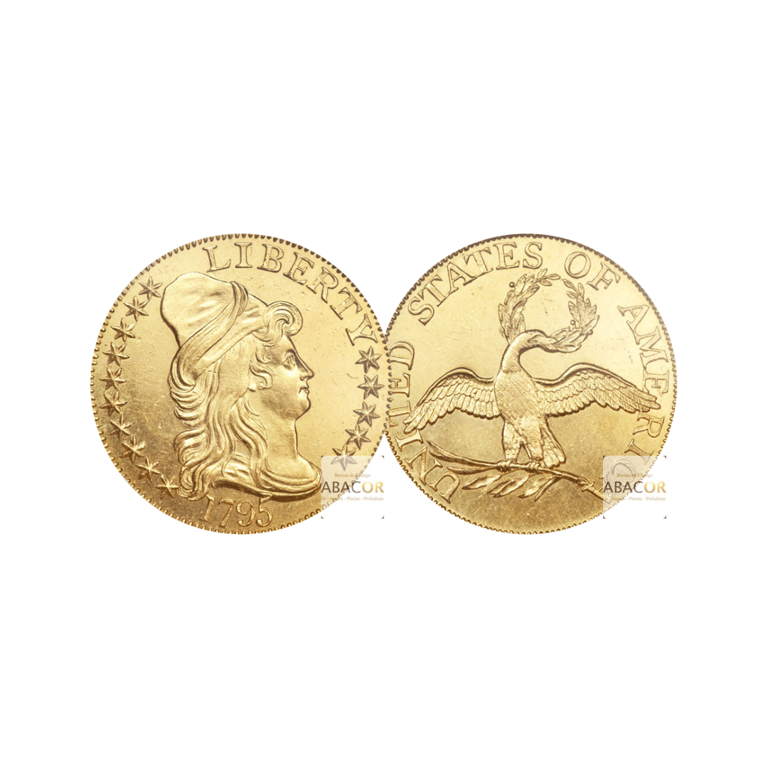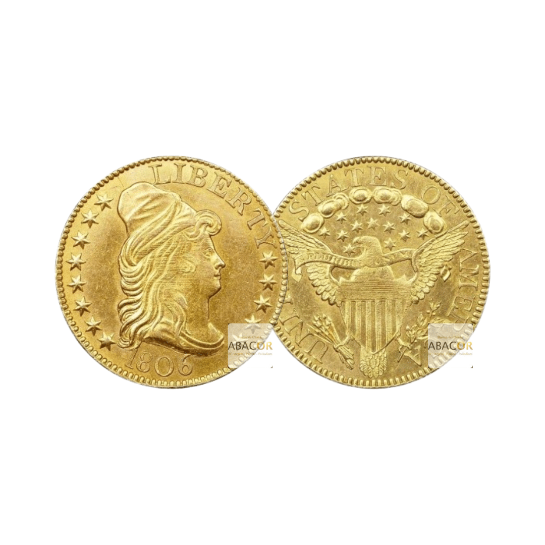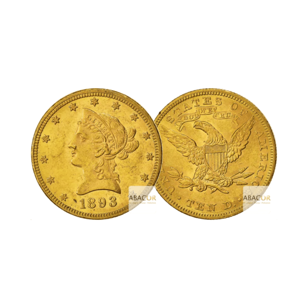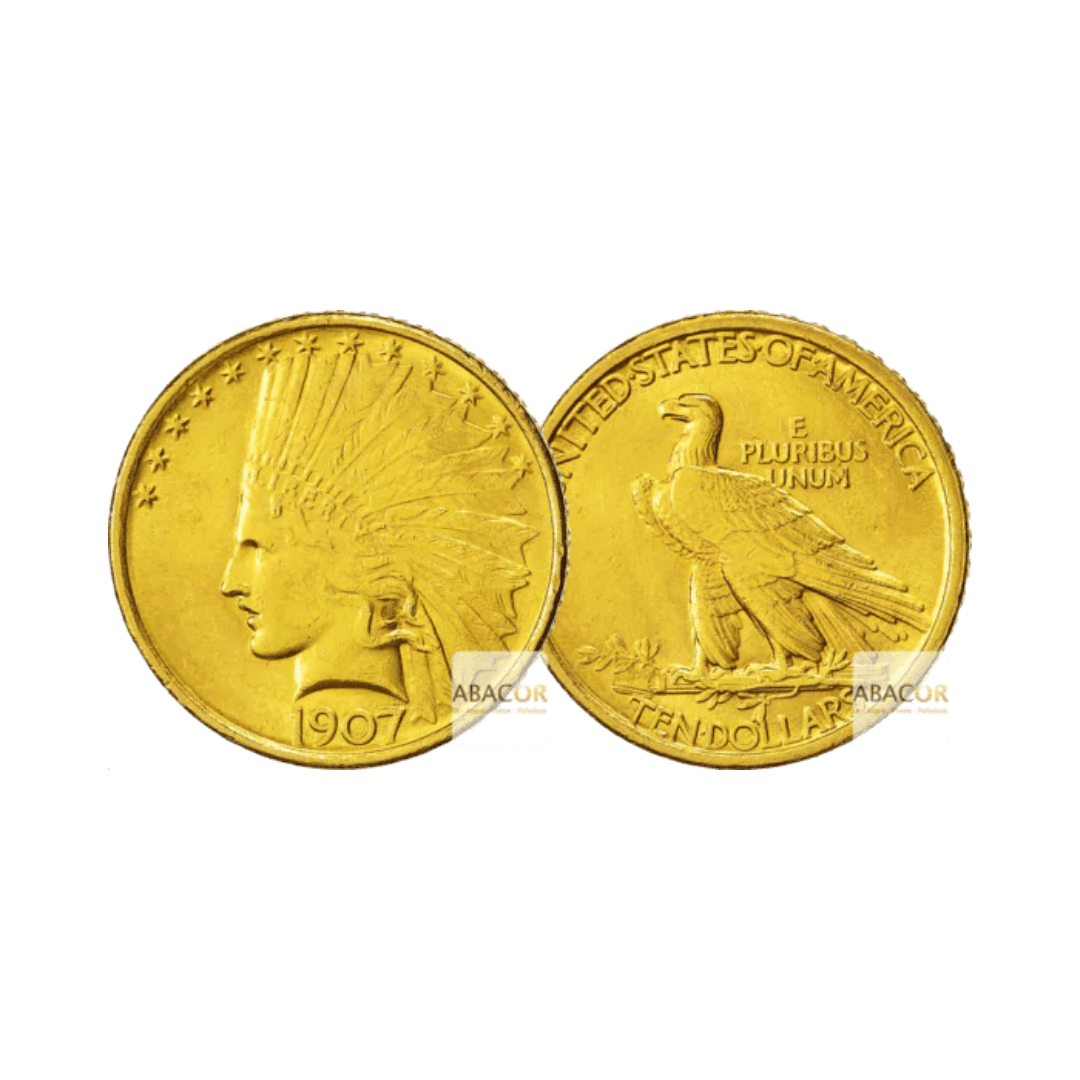 Pièces d’Or États-Unis. Les 10 dollars or Eagle sont des pièces historiques des États-Unis, frappées entre 1795 et 1933. Représentant une valeur faciale de 10 dollars, elles doivent leur nom à l’aigle majestueux figurant sur leur revers. Deux designs principaux marquent leur histoire : le Liberty Head (1838-1907), avec une Lady Liberty classique, et le Indian Head (1907-1933), conçu par Saint-Gaudens, qui présente une tête d’Indienne ornée d’un majestueux bonnet à plumes. Avec un poids de 16,718 grammes d’or, ces pièces sont à la fois des joyaux numismatiques et un investissement prisé.