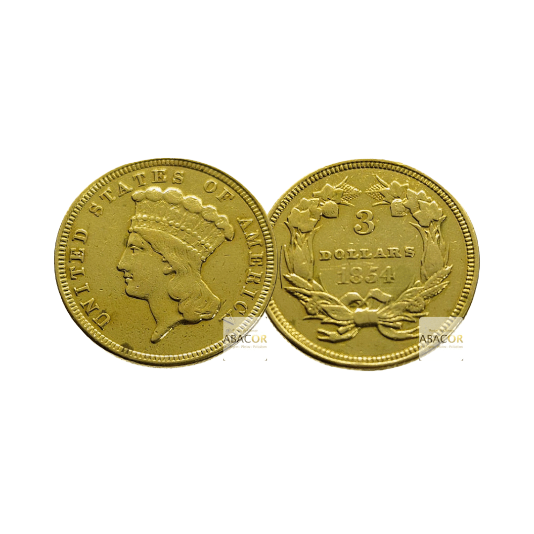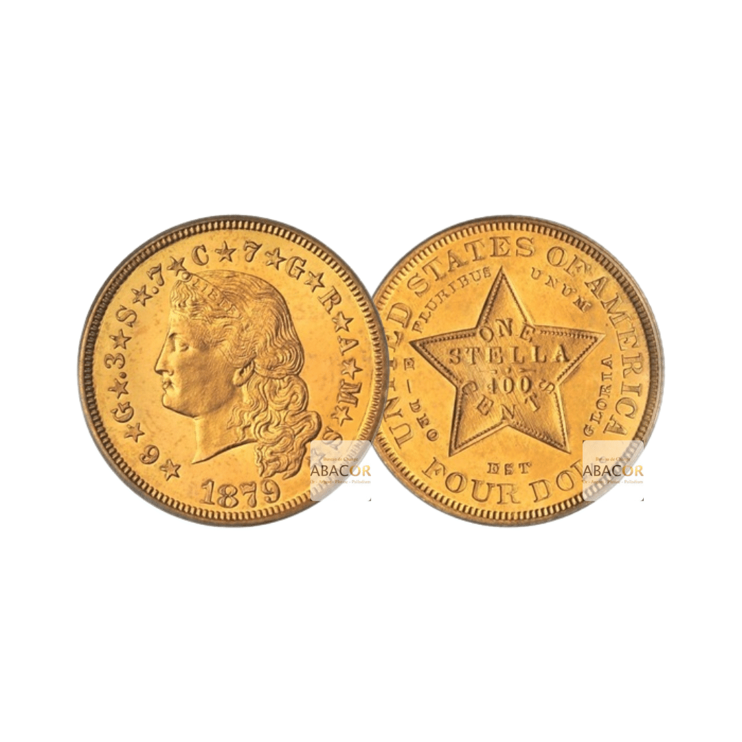 Pièces d’Or États-Unis. Les 3 dollars or (1854-1889) sont des pièces rares des États-Unis, créées pour faciliter certains paiements spécifiques, comme l’achat de feuilles de timbre-poste. Les 4 dollars or, aussi appelées « Stella », sont des pièces rares frappées uniquement en 1879 et 1880. Elles ont été conçues pour intégrer un système monétaire international basé sur l’or, mais le projet n’a jamais abouti. Ces pièces sont extrêmement recherchées par les collectionneurs en raison de leur rareté et de leur histoire unique.