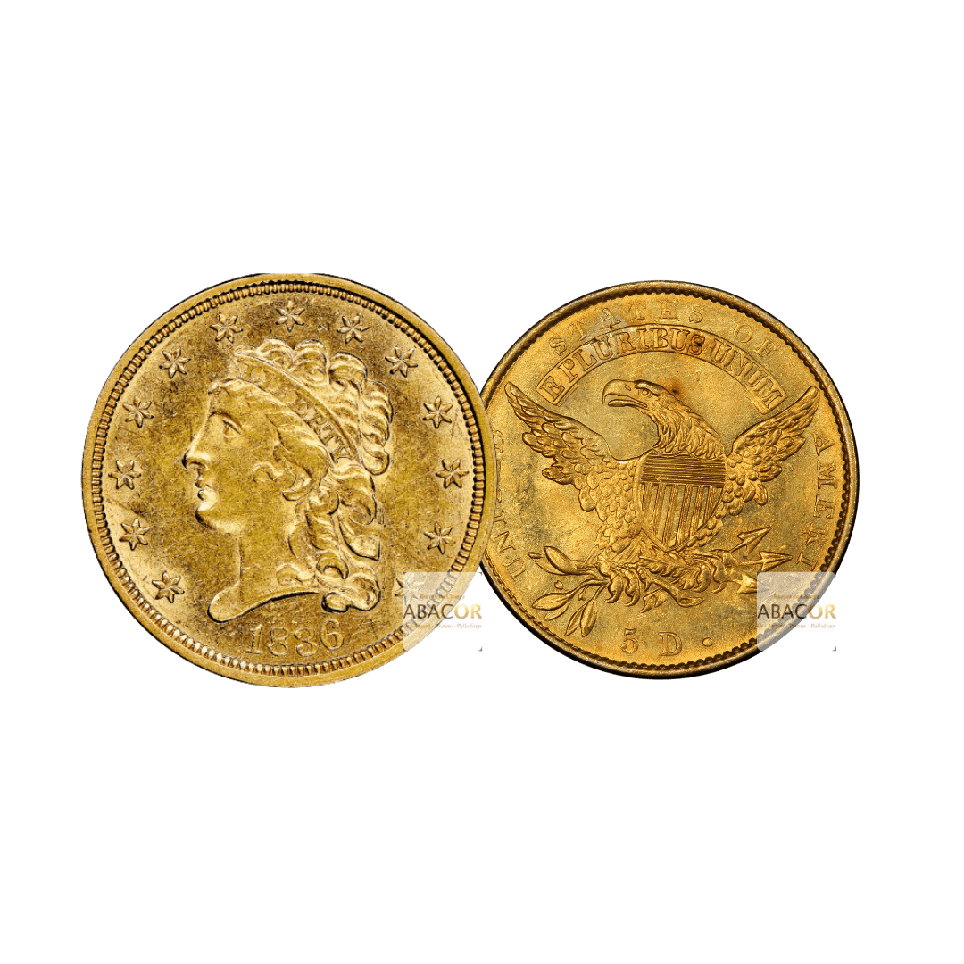 Pièces d’Or États-Unis. Les 5 dollars or Half Eagle sont les premières pièces d’or frappées par les États-Unis, produites de 1795 à 1929. Elles se distinguent par leur valeur faciale de 5 dollars et leurs designs emblématiques : le modèle Liberty Head (1839-1908), avec Lady Liberty, et le Indian Head (1908-1929), unique avec son motif en creux. Pesant 8,36 ou 8,75 grammes, elles incarnent à la fois l’histoire américaine et un attrait durable pour les collectionneurs et investisseurs.