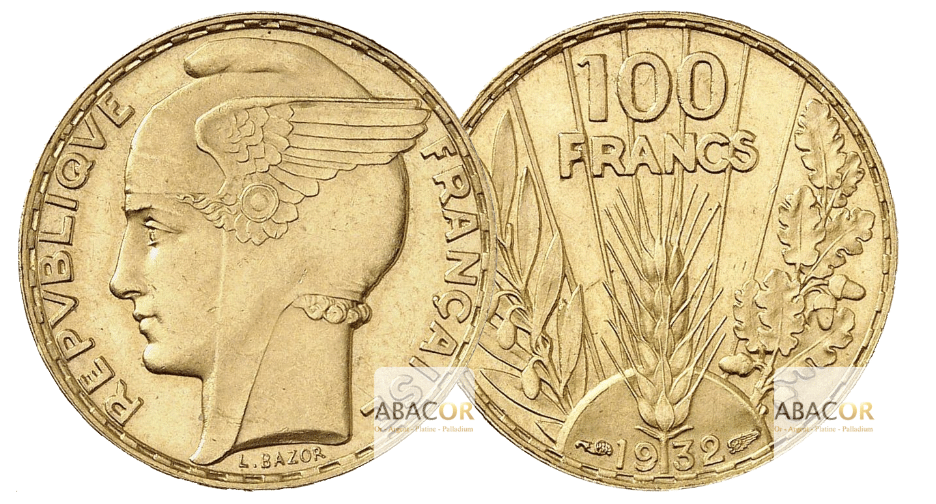 Pièces d’Or FRANCE. De fait, la Pièce de 100 Francs Or se distingue en tant que la Pièce d’Or française la plus imposante. Ceci, tant par sa taille que par son poids. Ainsi, cette pièce exceptionnelle, par sa dimension et sa masse, symbolise non seulement la richesse matérielle, mais aussi la grandeur historique et culturelle qu’elle représente. Elle incarne une période spécifique de l’histoire monétaire française. Dès lors, celle-ci offre aux collectionneurs une expérience unique en raison de son format généreux. Ce qui en fait une pièce incontournable pour ceux qui s’intéressent à la Numismatique. À savoir que la Pièce 100 Francs Bazo Or a été frappée en 1929. Celle-ci pèse 6,55g et son diamètre est de 21 mm.
