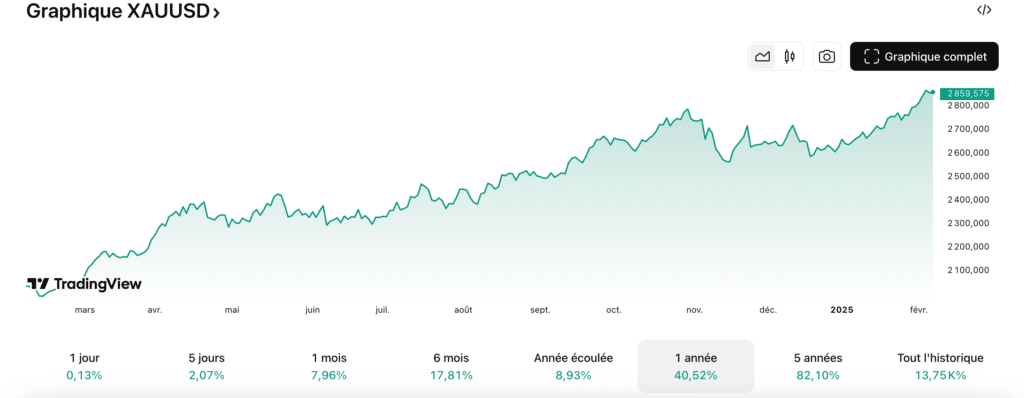 Ainsi, pour ceux qui cherchent à protéger et à faire fructifier leur capital de manière sécurisée, l’or représente une véritable opportunité, surtout en période de turbulences financières. De plus, sa stabilité fait qu’il est fréquemment recherché lors des crises économiques et des périodes d’instabilité des marchés financiers. En effet, sa valeur reste relativement stable avec quelques corrections sur le court terme, même lorsque les autres actifs peuvent fluctuer fortement.
