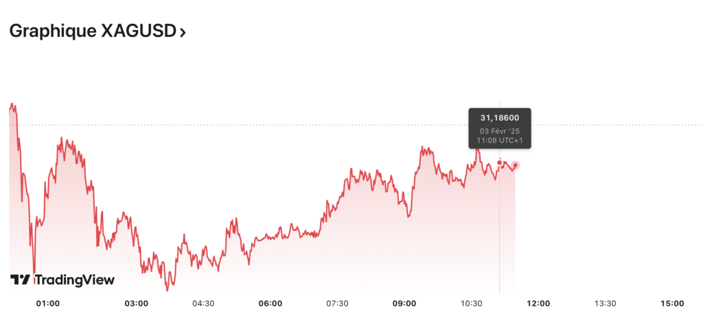 Prévision du cours de l’argent aujourd’hui 03/02. L’argent sous pression. En résumé, bien que le cours de l’argent soit actuellement sous pression, plusieurs facteurs pourraient influencer son évolution à moyen terme. L’incertitude économique mondiale, la montée des tensions commerciales et les décisions de la Fed seront déterminants pour l’orientation future du marché des métaux précieux. Pour les investisseurs, la prudence reste de mise, dans un environnement où la volatilité pourrait demeurer élevée.