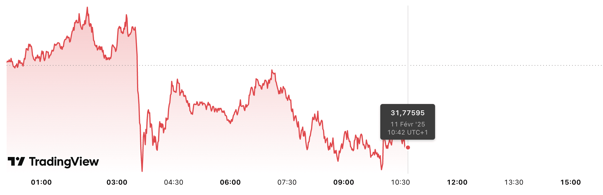 En revanche, le marché reste vulnérable tant qu’il se maintient sous cette résistance. Un facteur de soutien à court terme est l’EMA (moyenne mobile exponentielle) à 50 jours, qui se situe actuellement autour de 31 $. Ce niveau sert de plancher temporaire et pourrait empêcher une chute plus prononcée si les vendeurs prennent le dessus.