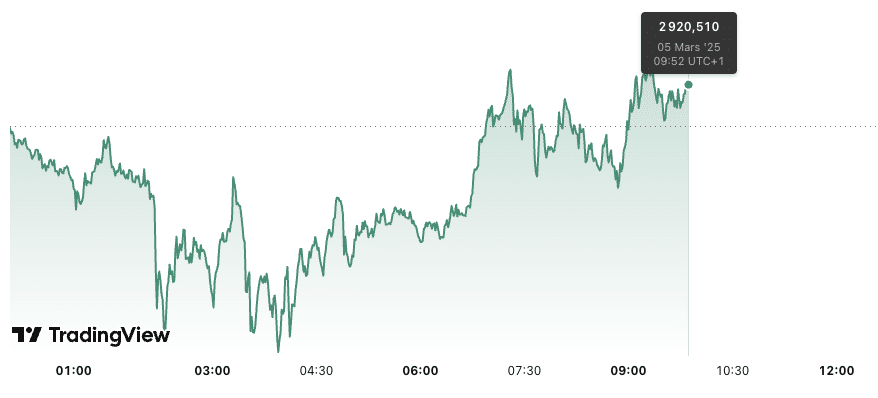 Prévision du cours de l’or aujourd’hui 05/03. Aujourd’hui, le cours de l’or (XAU/USD) est en hausse de 0,2 % et s’élève à 2 920,51 dollars l’once à 11h26 UTC+1. En outre, le prix du kilo d’or est estimé à 87 650,00 euros et le prix du gramme d’or 24 carats à 87,65 euros.