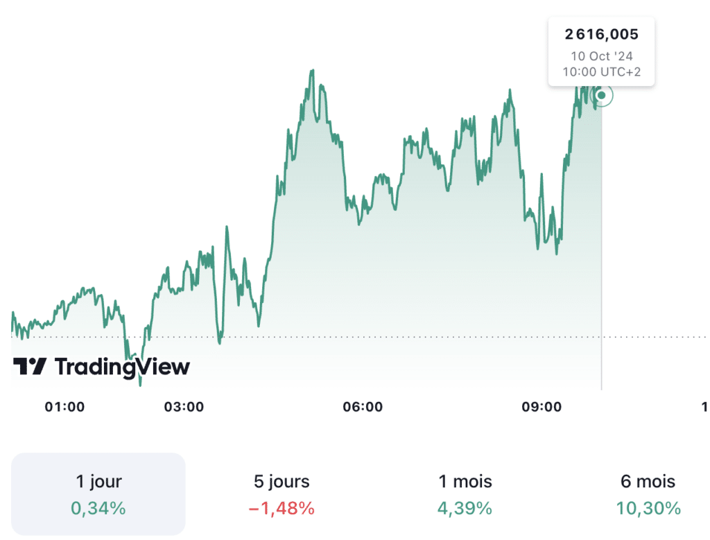 À la question : Quelles sont les prévisions du cours de l’or aujourd’hui ? La réponse est la suivante. Aujourd’hui, le cours de l’or (XAU/USD) s’élève à 2 616 dollars l’once et affiche une tendance à la légère hausse par rapport à hier mais reste dans la tranche basse depuis trois semaines.