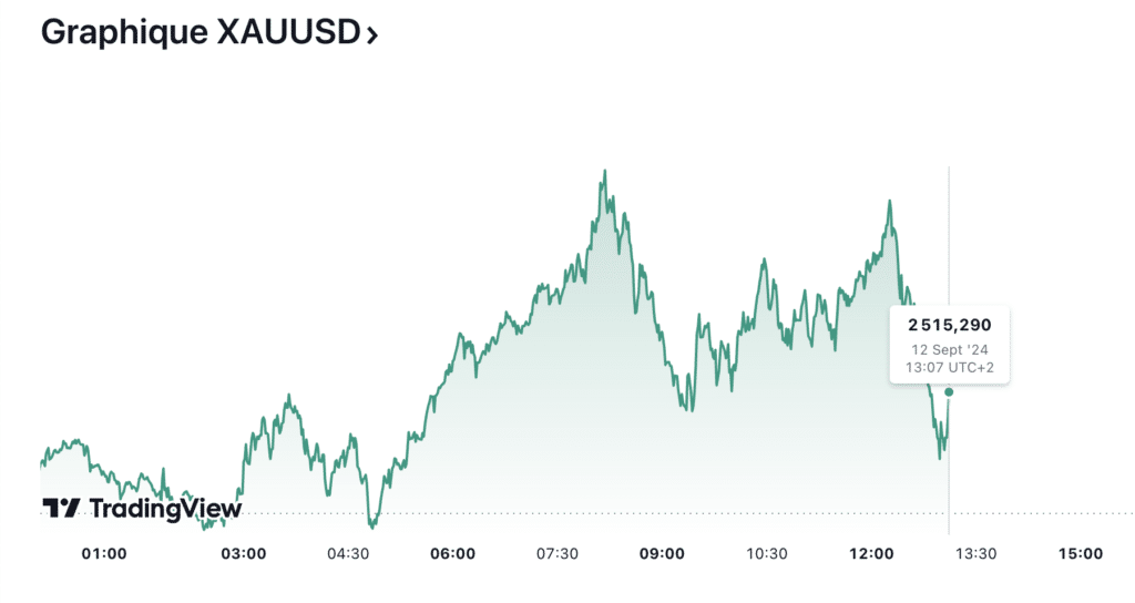 Prévision du cours de l’or 12/09. En ce jeudi 12 septembre 2024, le cours de l’or (XAU/USD) affiche une légère progression, atteignant 2 515,29 dollars l’once. Ceci, avec un pic intraday de 2 521,90 dollars à 8h11 UTC+2. Toutefois, malgré cette remontée le métal jaune reste en deçà de son record historique, à 2 531 dollars le 20 août dernier. Cependant, la tendance haussière actuelle du marché suggère que l’or pourrait continuer à grimper dans les jours à venir. En effet, plusieurs facteurs influencent cette évolution? Notamment, la hausse des rendements des obligations du Trésor américain, un dollar fort, ainsi que l’attente d’une éventuelle baisse des taux d’intérêt par la Réserve fédérale (Fed). Ce contexte économique global joue un rôle clé dans les ajustements que subit actuellement le prix de l’or. Les experts Abacor décryptent pour vous !
