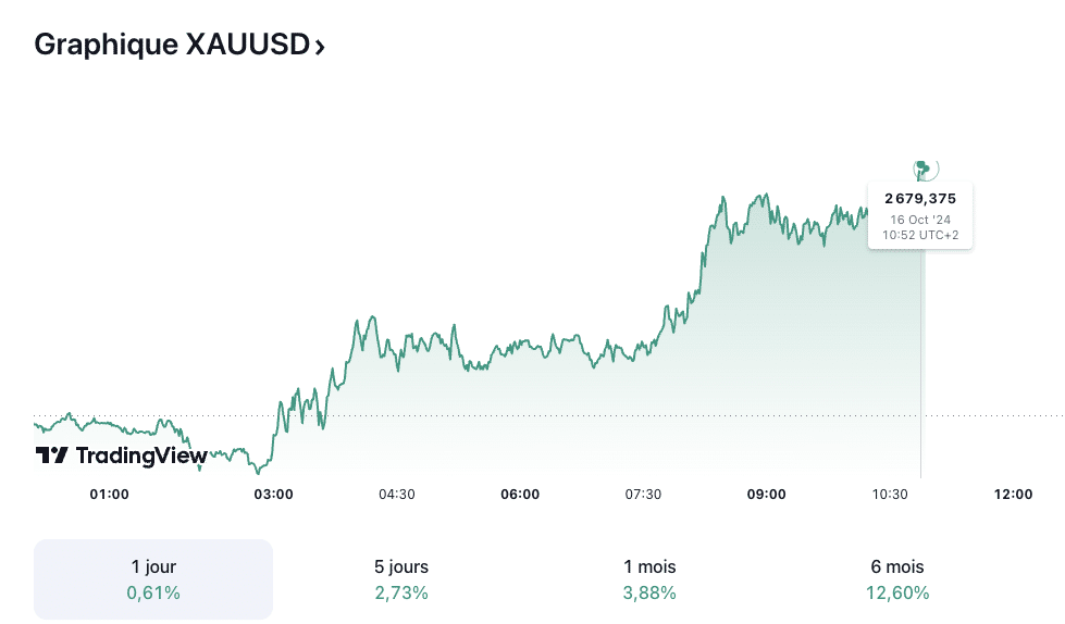 À la question : Quelles sont les prévisions du cours de l’or aujourd’hui ? La réponse est la suivante. Aujourd’hui, le cours de l’or (XAU/USD) s’élève à 2 679,37 dollars l’once et affiche une tendance haussière importante selon les traders, qui ont les yeux rivés sur la prochaine baisse des taux par la Fed qu’ils prévoient en novembre.