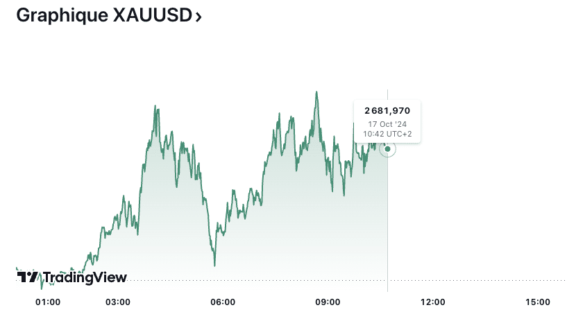 Prévision du cours de l’or aujourd’hui 17/10 : La dynamique haussière se renforce. Aujourd’hui, le cours de l’or (XAU/USD) est en augmentation de 0,28 % et s’élève à 2 681,97 dollars l’once à 10h42 UTC+2. En outre, le prix du kilo d’or est estimé à 79 464,36 euros et le prix du gramme d’or 18 carats à 79.42 euros.