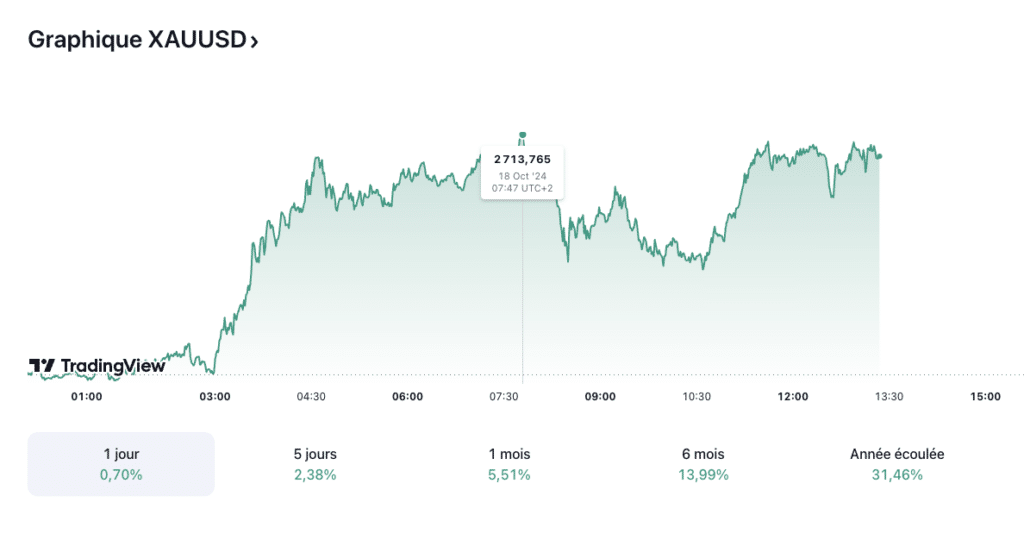 Prévision du cours de l’or 18/10: L’or atteint des sommets records. Le cours de l’or (XAU/USD), considéré comme une valeur refuge, atteint des sommets records, s’élevant à 2 701,80 dollars l’once le 18 octobre à 10h38. Ainsi, l’or se positionne une fois de plus comme un refuge incontournable dans un contexte économique et politique marqué par des incertitudes croissantes. Le métal précieux continue de jouer un rôle clé, soutenu par des décisions stratégiques des banques centrales, la dynamique économique mondiale, et des tensions géopolitiques.