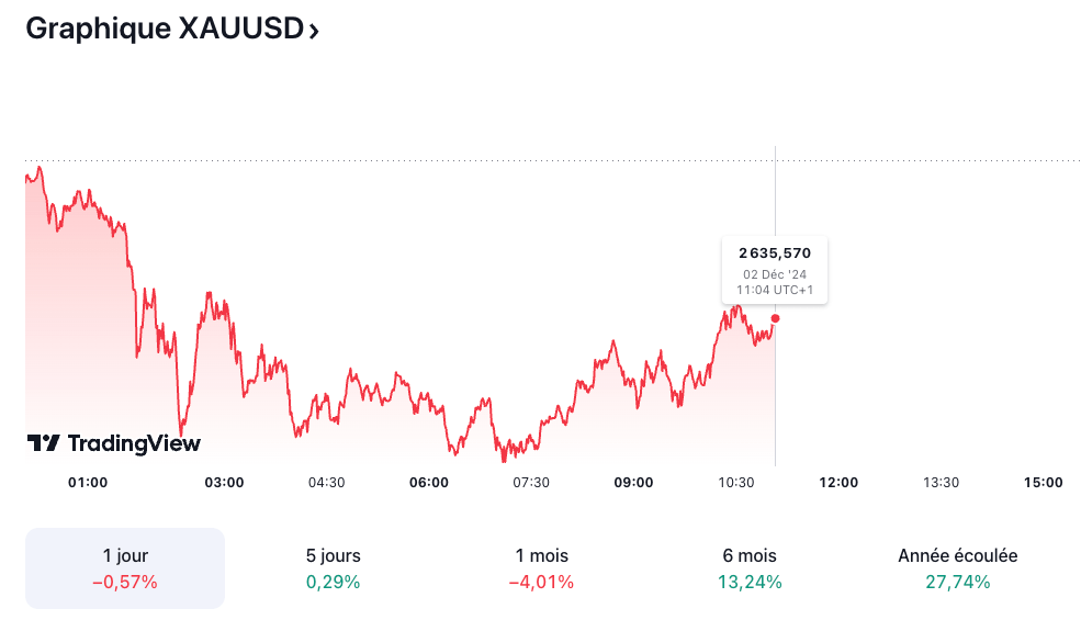 Aujourd’hui, le cours de l’or (XAU/USD) est en légère baisse de 0,5 % et s’élève à 2 635,57 dollars l’once à 11h04 UTC+1. En outre, le prix du kilo d’or est estimé à 80 559 euros et le prix du gramme d’or 24 carats à 80,60 euros.