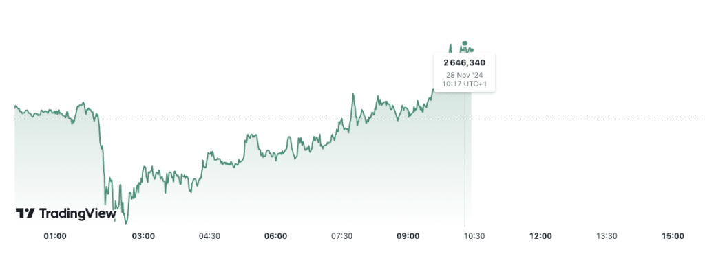 Aujourd’hui, le cours de l’or (XAU/USD) est en légère hausse de 0,36 % et s’élève à 2 646,340 dollars l’once à 10h17 UTC+1. En outre, le prix du kilo d’or est estimé à 80 660,39 euros et le prix du gramme d’or 24 carats à 80,66 euros.