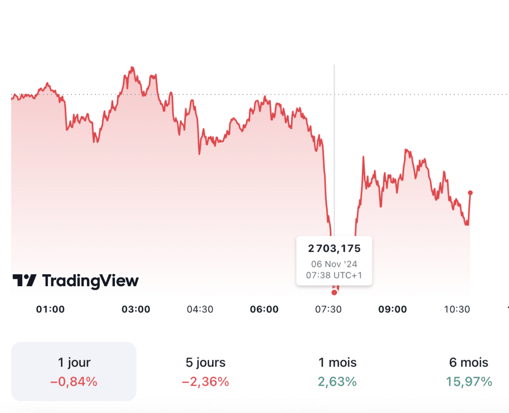 En outre, avec Trump en avance dans plusieurs États clés, les marchés réagissent en conséquence. Ainsi, l’or, un actif prisé en période d’incertitude, a vu son prix baisser à 2 703,175 dollars l’once à 07h38 en raison de la force croissante du dollar américain et de la hausse des rendements des bons du Trésor.