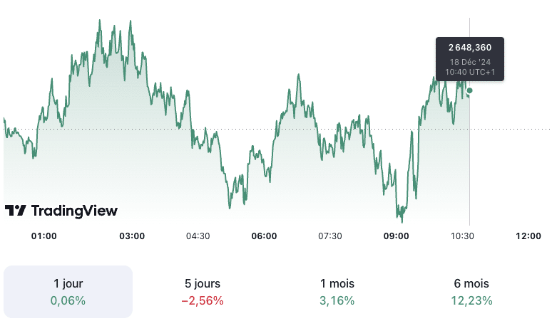 Aujourd’hui, le cours de l’or (XAU/USD) est en légère hausse de 0,06 % et s’élève à 2 648,360 dollars l’once à 10h40 UTC+1. En outre, le prix du kilo d’or est estimé à 81 106,97 euros et le prix du gramme d’or 24 carats à 81,11 euros.