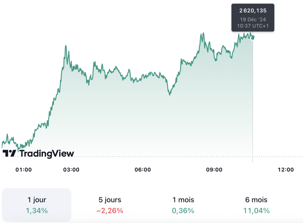 Aujourd’hui, le cours de l’or (XAU/USD) est en baisse de 1,34 % et s’élève à 2 620,135 dollars l’once à 10h37 UTC+1. En outre, le prix du kilo d’or est estimé à 80 914,06 euros et le prix du gramme d’or 24 carats à 80,91 euros.
