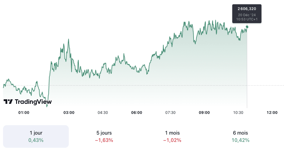 Aujourd’hui, le cours de l’or (XAU/USD) est en légère hausse de 0,4 % et s’élève à 2 606,320 dollars l’once à 10h53 UTC+1. En outre, le prix du kilo d’or est estimé à 80 725,01 euros et le prix du gramme d’or 24 carats à 80,72 euros.