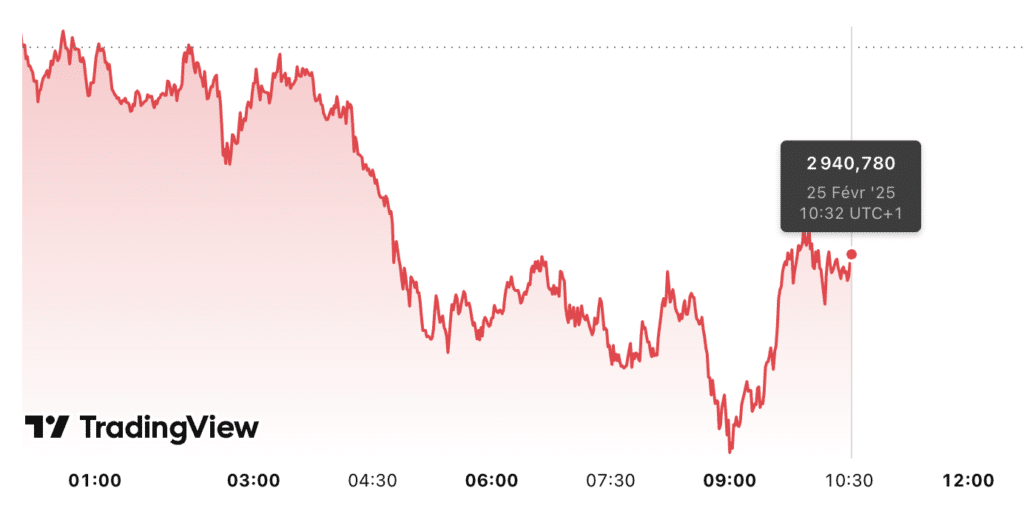 Prévision du cours de l’or aujourd’hui 25/02. Aujourd’hui, le cours de l’or (XAU/USD) est en baisse de 0,41 % et s’élève à 2 940,78 dollars l’once à 10h32 UTC+1. En outre, le prix du kilo d’or est estimé à 90 225,06 euros et le prix du gramme d’or 24 carats à 90,22 euros.