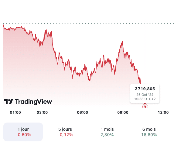 Prévision du cours de l’or 25/10. Aujourd’hui, le cours de l’or (XAU/USD) est en légère baisse de 0,60 % et s’élève à 2 719,805 dollars l’once à 10h38 UTC+2. En outre, le prix du kilo d’or est estimé à 80 721,80 euros et le prix du gramme d’or 24 carats à 80,72 euros.