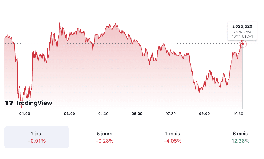 Aujourd’hui, le cours de l’or (XAU/USD) est en légère baisse baisse de 0,01 % et s’élève à 2 625,520 dollars l’once à 10h41 UTC+1. En outre, le prix du kilo d’or est estimé à 80 414,75 euros et le prix du gramme d’or 24 carats à 80,41 euros.