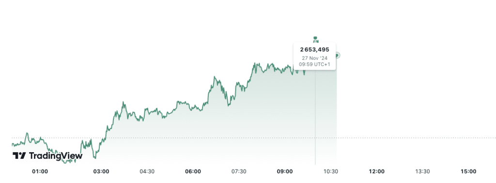 Aujourd’hui, le cours de l’or (XAU/USD) est en légère hausse de 0,6 % et s’élève à 2 653,495 dollars l’once à 09h59 UTC+1. En outre, le prix du kilo d’or est estimé à 80 970,32 euros et le prix du gramme d’or 24 carats à 80,97 euros.