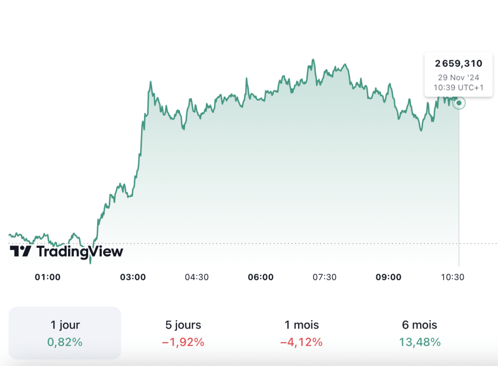 Aujourd’hui, le cours de l’or (XAU/USD) est en légère hausse de 0,82 % et s’élève à 2 659,310 dollars l’once à 10h39 UTC+1. En outre, le prix du kilo d’or est estimé à 80 898,31 euros et le prix du gramme d’or 24 carats à 80,90 euros.