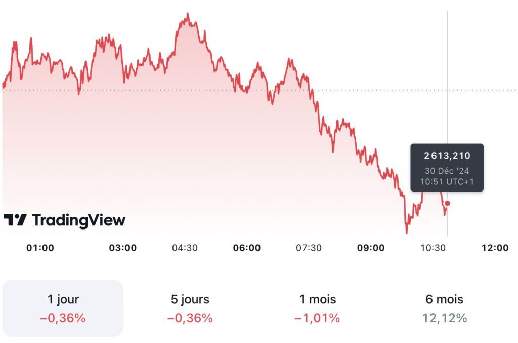 Aujourd’hui, le cours de l’or (XAU/USD) est en légère baisse de 0,3 % et s’élève à 2 613,21 dollars l’once à 10h51 UTC+1. En outre, le prix du kilo d’or est estimé à 80 412,50 euros et le prix du gramme d’or 24 carats à 80,41 euros.