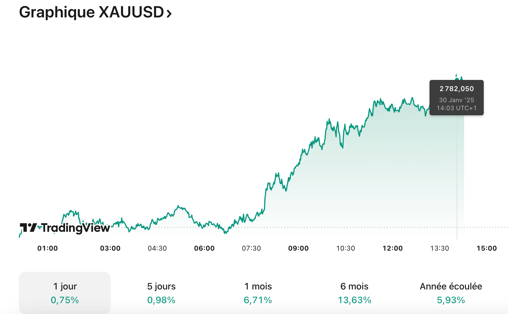 Prévision du cours de l’or aujourd’hui 30/01. Le cours de l’or dépasse la barre des 2 780 dollars l’once, alors que les investisseurs scrutent les signaux de la Fed et les tensions commerciales. Par ailleurs, l’incertitude liée aux politiques de Trump renforce la demande de valeur refuge. Ce qui renforce l’attrait de l’or. Enfin, l’argent reste haussier, mais doit franchir des résistances clés pour poursuivre sa montée. Les traders ont les yeux rivés sur les niveaux critiques pour anticiper la prochaine direction du marché.