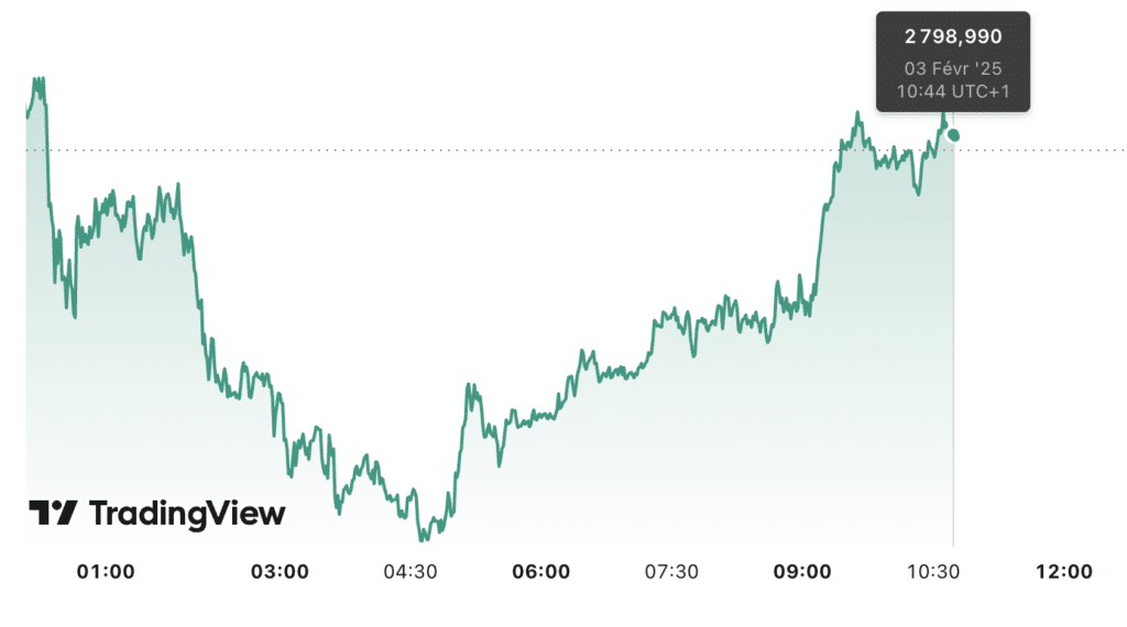 L’imposition de droits de douane par le président Trump sur les importations du Canada, du Mexique et de la Chine a provoqué une ruée vers le dollar. En conséquence, l’attrait de l’or a temporairement diminué. Cela a entraîné une correction des cours à 2 785 dollars l’once. Toutefois, l’anticipation d’un assouplissement monétaire par la Fed empêche une chute plus marquée.