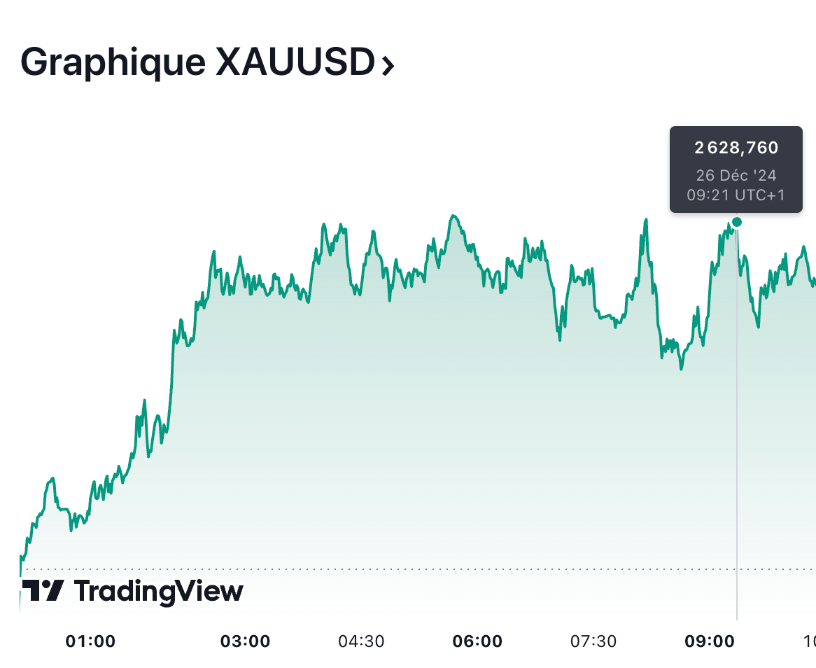 Quelles sont les prévisions du cours de l’or aujourd’hui ? Aujourd’hui, le cours de l’or (XAU/USD) est en légère baisse et s’élève à 2 628,76 dollars l’once.