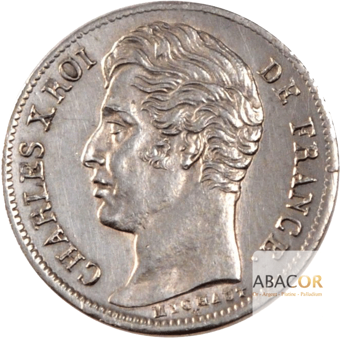 Avers : Titulature : CHARLES X ROI DE FRANCE. Description: Tête nue de Charles X à gauche ; au-dessous MICHAUT. T (cursif).