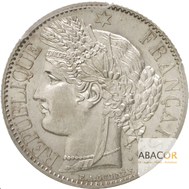 Avers : Titulature : REPUBLIQUE FRANCAISE. Description: Tête de la République à gauche en Cérès, déesse des moissons, portant un collier de perles, un double chignon et une couronne composite de blé, fleurs, olivier et olives, chêne et glands, nouée par un ruban descendatn sur le cou et passant sur le front où est inscrit le mot CONCOR ; sous la tranche du cou le long du listel E. A. OUDINE. F.