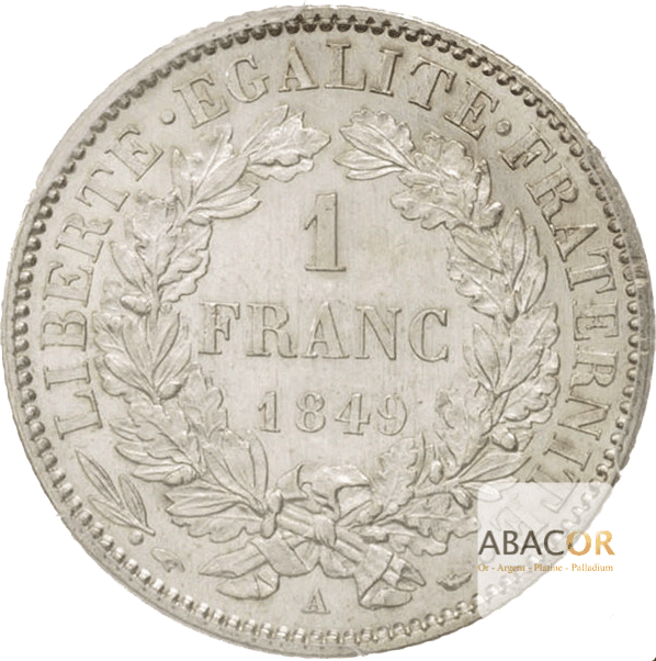 Revers : Titulature :LIBERTE EGALITE FRATERNITE. Description: 1 / FRANC, en deux lignes dans le champ, au-dessus du millésime, dans une couronne composite de deux branches de chêne et de deux de laurier, nouées deux par deux en bas par un ruban ; sous le nœud, la lettre d’atelier.