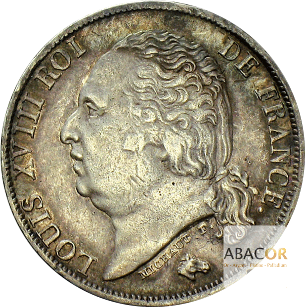 Avers : Titulature : LOUIS XVIII ROI DE FRANCE. Description: Tête nue de Louis XVIII à gauche, les cheveux noués par un ruban ; au-dessous MICHAUT. F. et la tête de cheval de Nicolas-Pierre Tiolier.