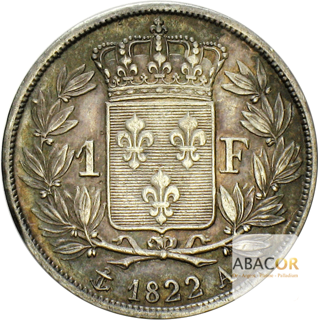 Revers : Titulature : 1 / F. Description: en accostement d’un écu de France sommé d’une couronne royale, contenu dans une couronne ouverte composée de deux branches de laurier nouées à leur base par un ruban ; au-dessous le millésime entre le différent à gauche et la lettre d’atelier à droite.