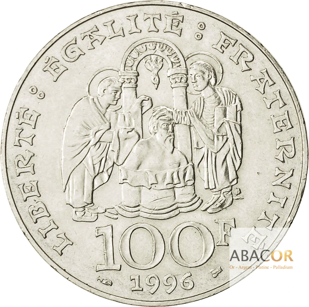 Revers : Titulature : LIBERTÉ : ÉGALITÉ : FRATERNITÉ // 100 F / (différent) 1996 (différent). Description : Représentation de style roman du baptême de Clovis à Reims par deux saints.