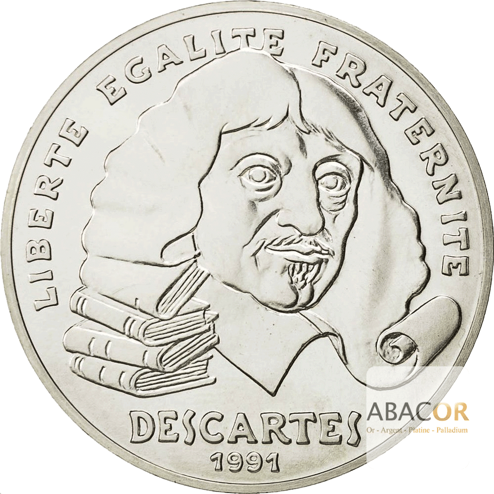 Avers : « LIBERTE EGALITE FRATERNITE / DESCARTES / 1991 » – Portrait de Descartes de face, les cheveux se terminant d’un côté par une pile de livres, de l’autre par un parchemin.