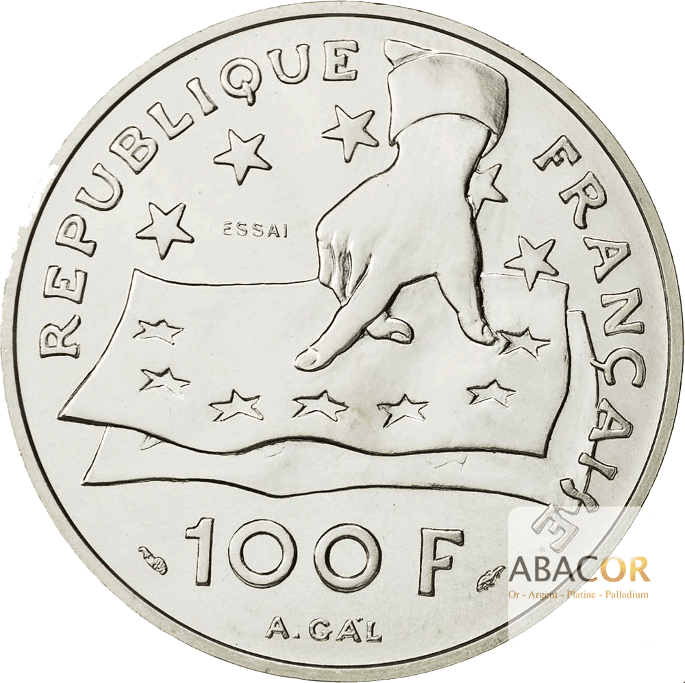 Revers : « REPUBLIQUE FRANÇAISE / 100 F » Une main indiquant du doigt un parchemin entouré des douze étoiles de l’Union Européenne ; signé A. GAL à l’exergue.