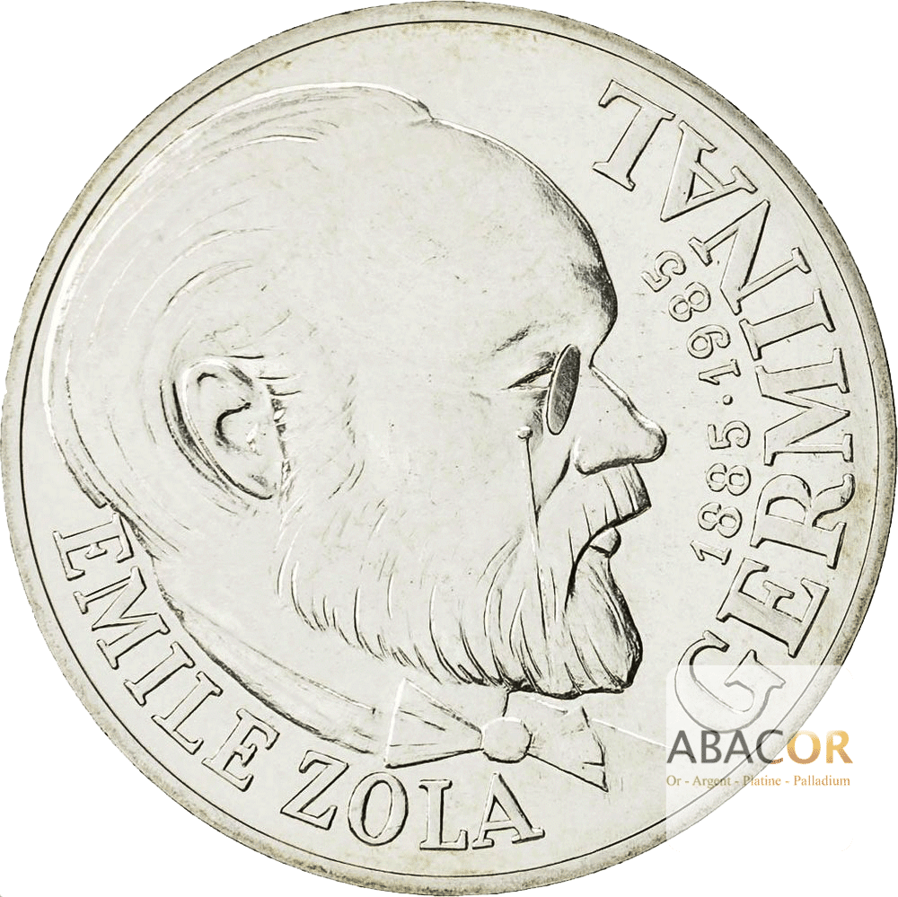 Avers : « EMILE ZOLA / GERMINAL // 1885 – 1985 » – Buste d’Emile Zola à droite, portant lorgnon et noeud papillon.