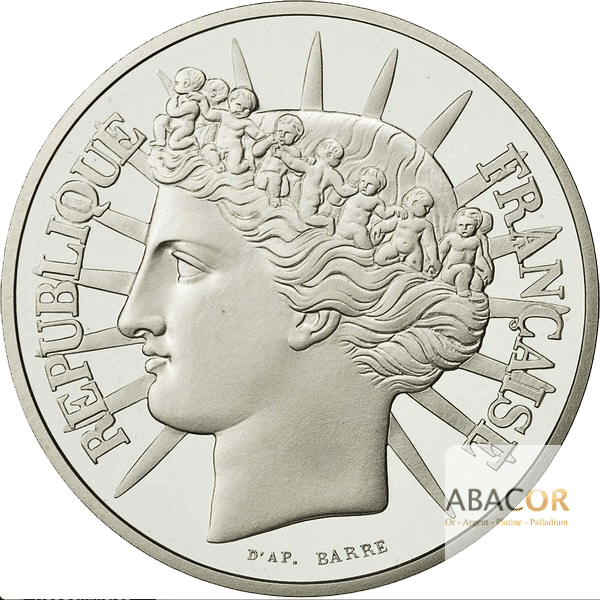 Avers : « REPUBLIQUE FRANCAISE » – Tête de République rayonnant à gauche couronnée d’une ronde d’enfants se tenant la main ; signé D’AP. BARRE à l’exergue le long du listel.